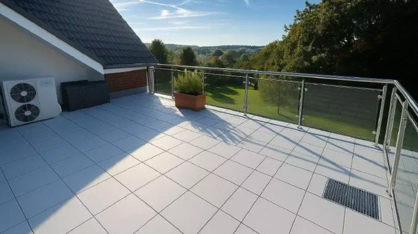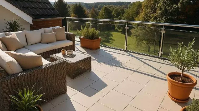 Wohnbereich mit hellen Fliesen, dazu ein riesiger Balkon mit elektrischen Rollläden, der