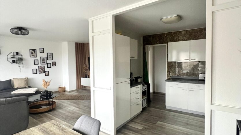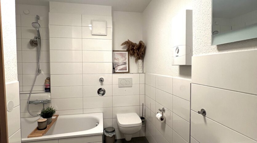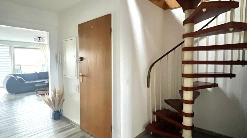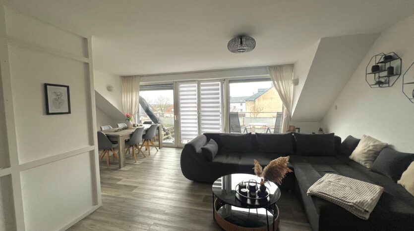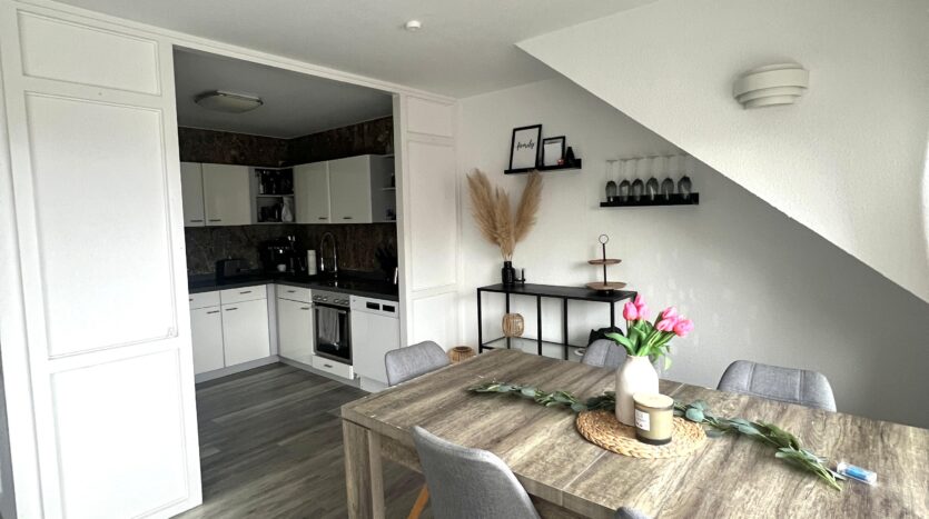 Die Wohnung ist gut ausgestattet und verfügt über zwei Wohnebenen. Ein gemütlicher Kachelofen und ein großzügiges Wohnzimmer mit offener Einbauküche, sowie ein großes Schlafzimmer mit eigenem Bad im Spitzboden runden die Wohnatmosphäre ab.